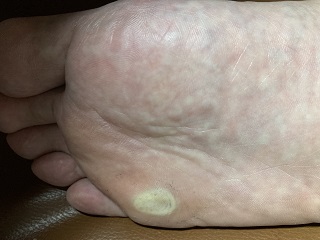 10日ほど前に風呂場で右足の裏が痛いので見ると、白い魚の目のようなものができていた。