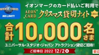 イオンカードのUFJ(ユニバーサル・スタジオ・ジャパン)クリスマス貸切ナイト2022の募集が始まっています。イオンカードのUFJ(ユニバーサル・スタジオ・ジャパン)クリスマス貸切ナイトは、2020年のキャンペーンに当選しました。⇒【イオンカ...